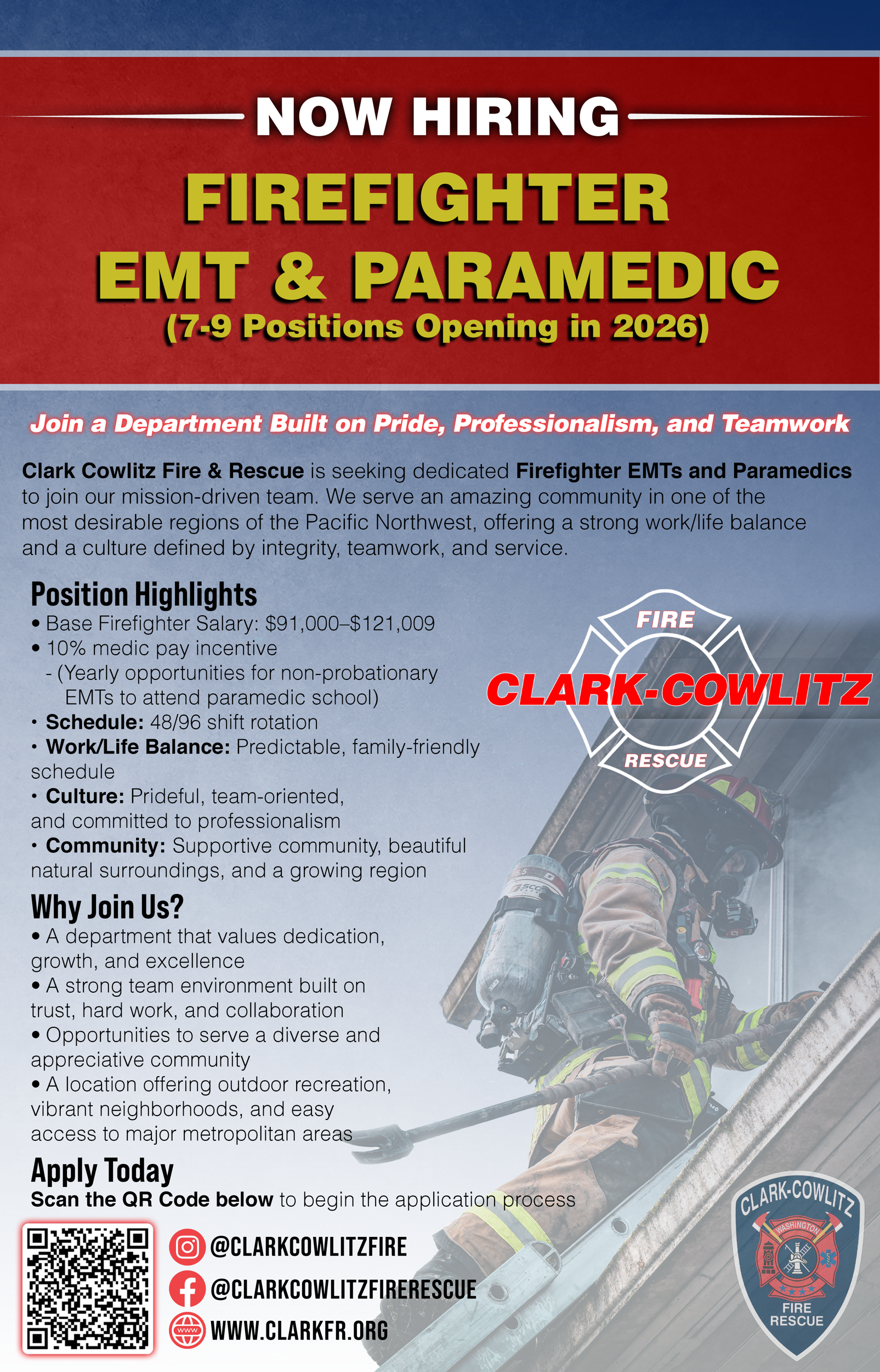 Clark Cowlitz Fire & Rescue (CCFR) will establishing the next eligibility list for Entry Level Firefighter/EMT in June 2026. |
