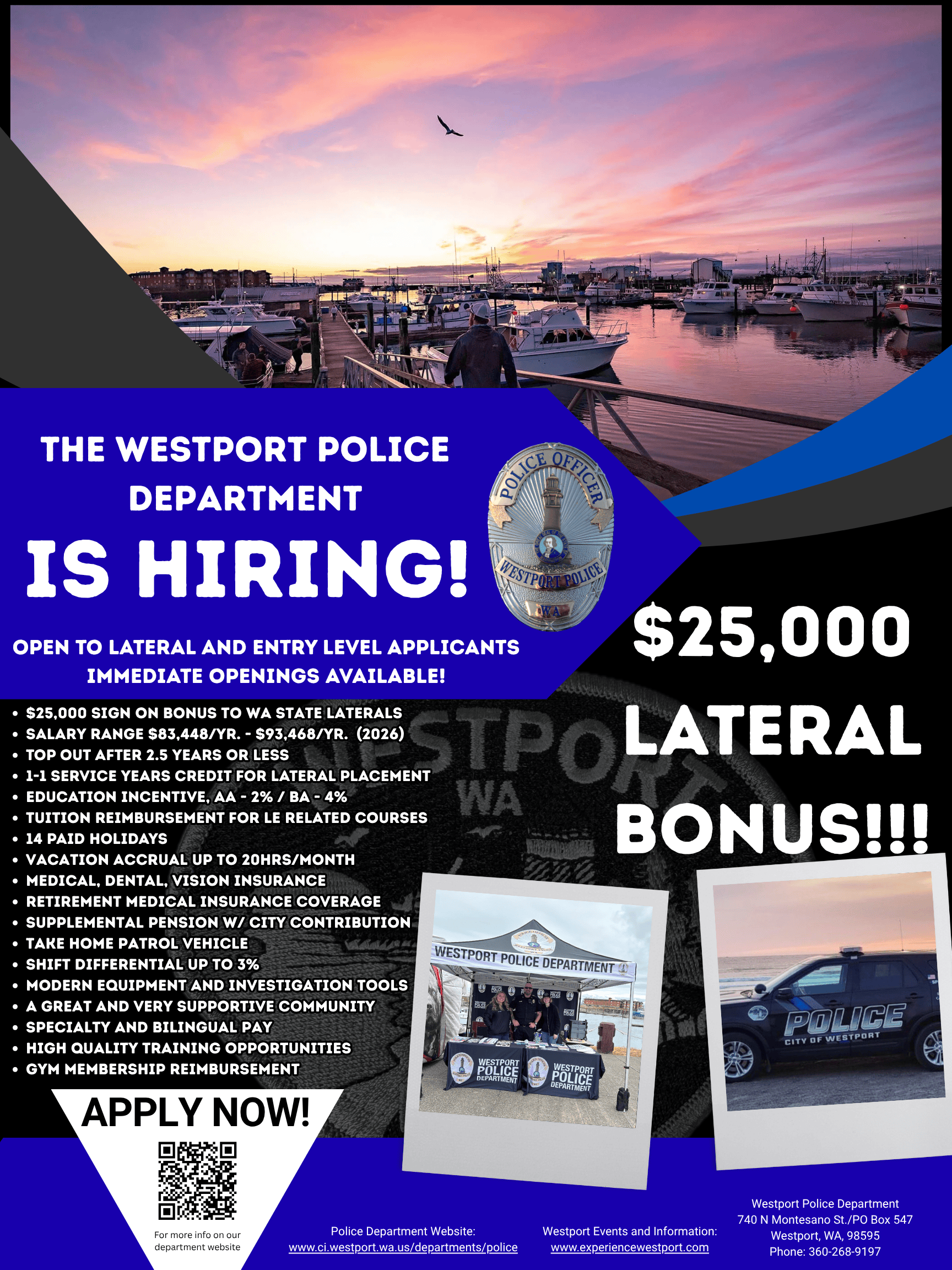 The City of Westport is testing for either a Lateral, Exceptional Lateral or Entry Level Police Officer position. Those applicants who are successful in the testing process will be placed on an eligibility list for potential full-time employment.